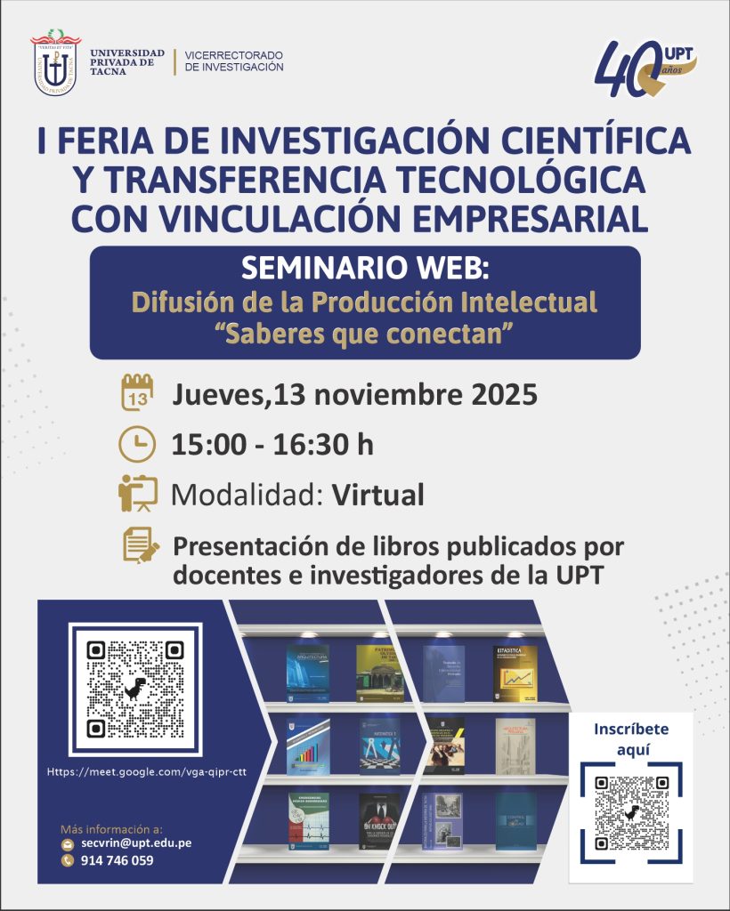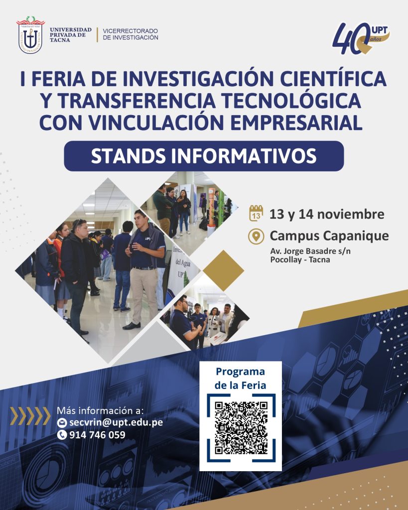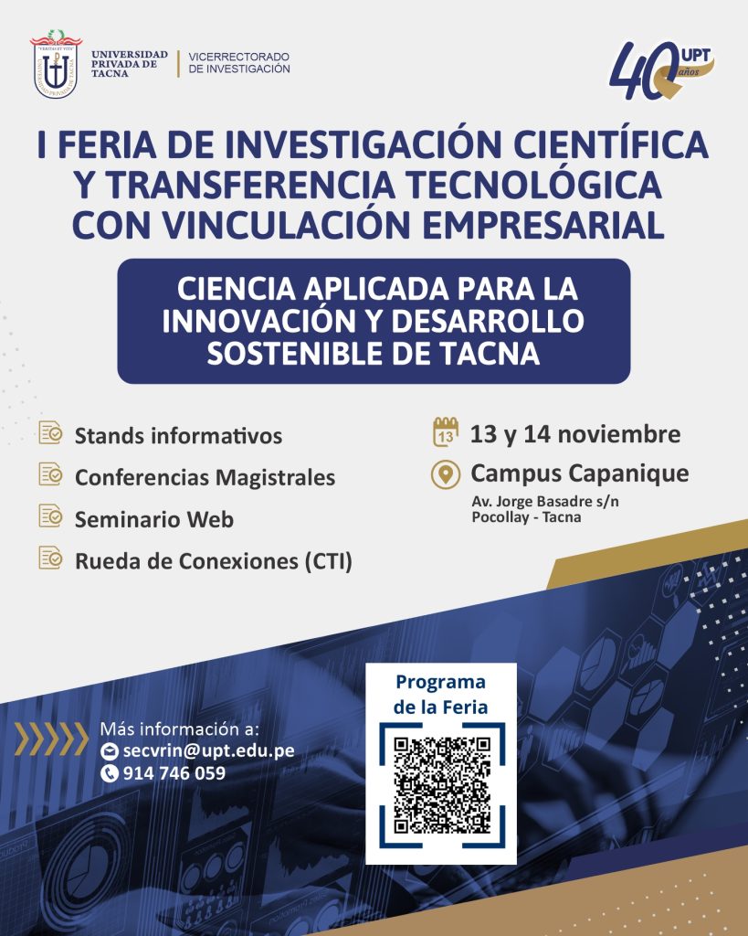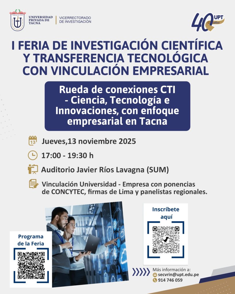 Conoce más de la I Feria de Investigación Científica y Transferencia Tecnológica con Vinculación Empresarial visitando el siguiente enlace: https://upt40.pe/feria/